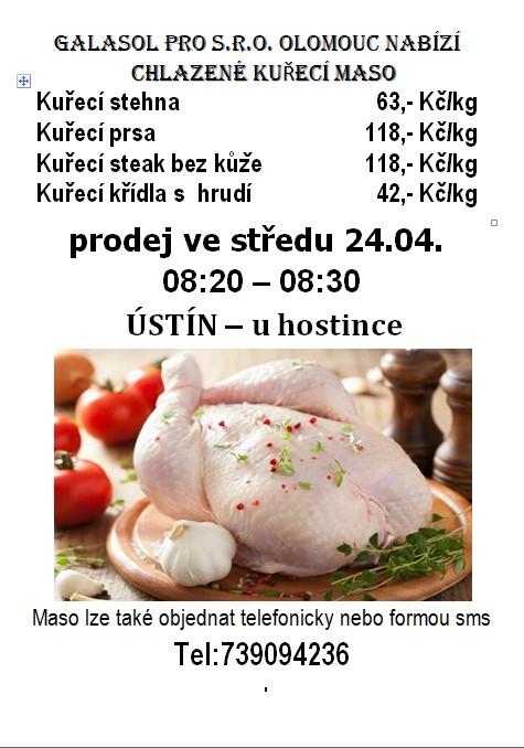Úvod > Život v obci > Aktuality > GALASOL PRO s.r.o. Olomouc - prodej chlazeného kuřecí masa