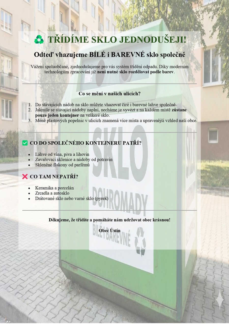 Sběrová místa pro tříděný odpad (plasty, papír, sklo bílé, sklo barevné, tetrapack):